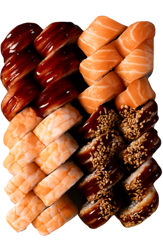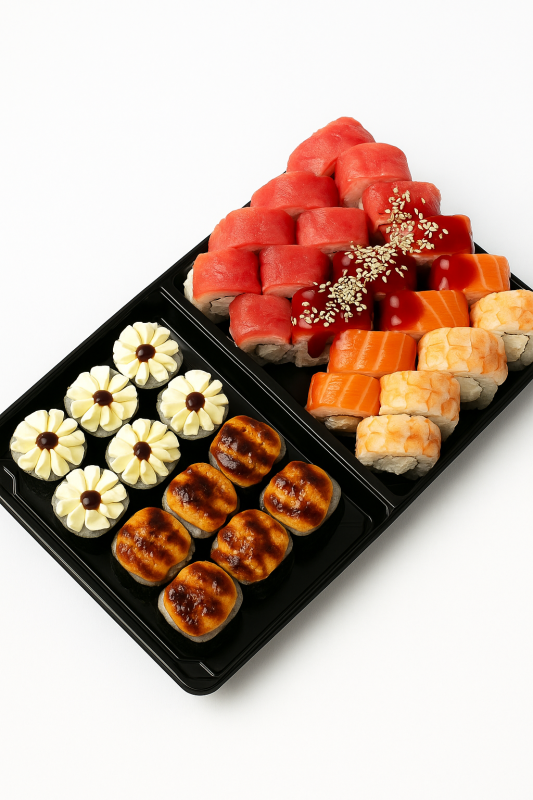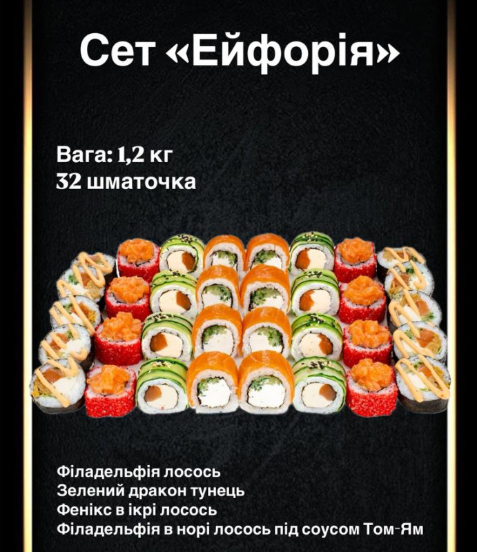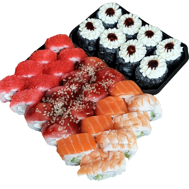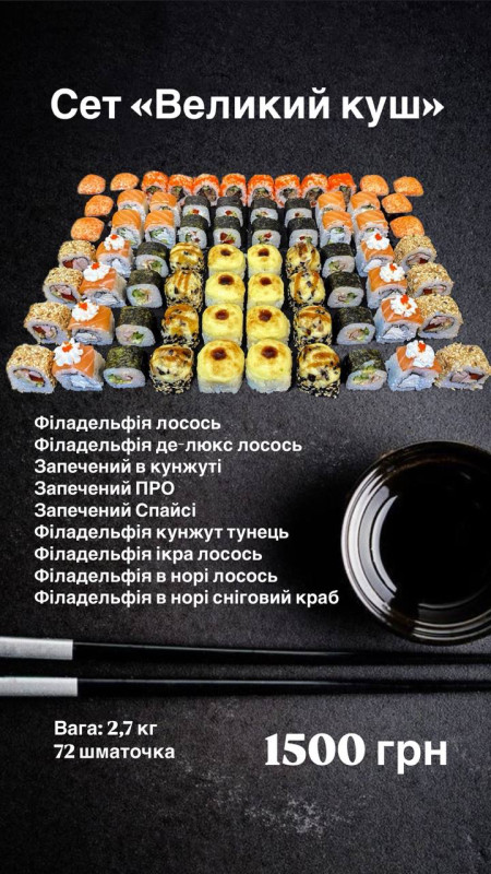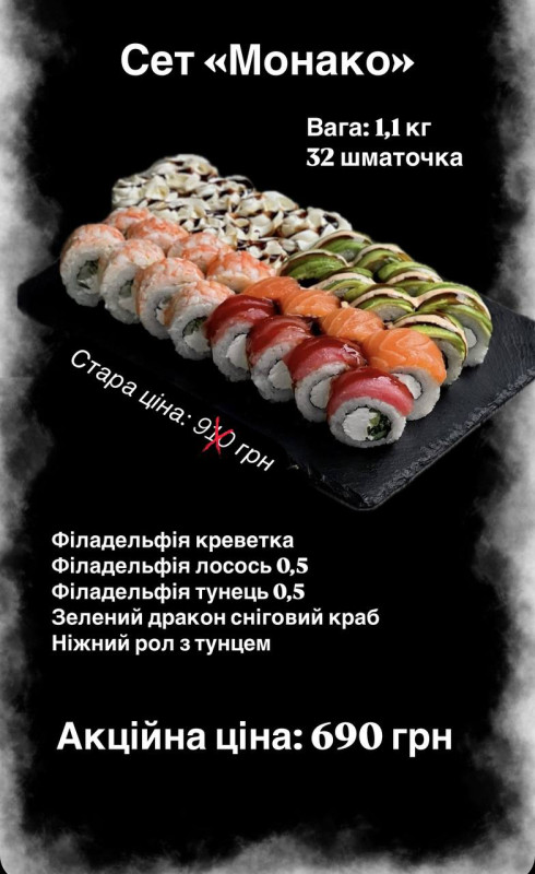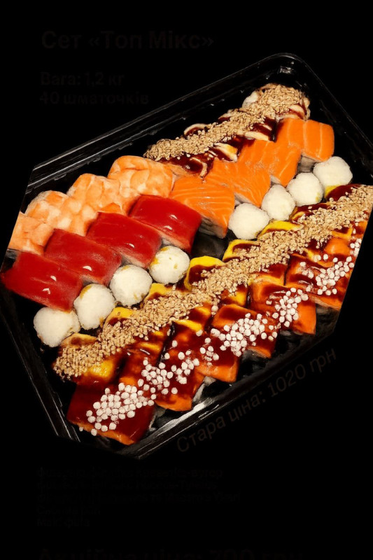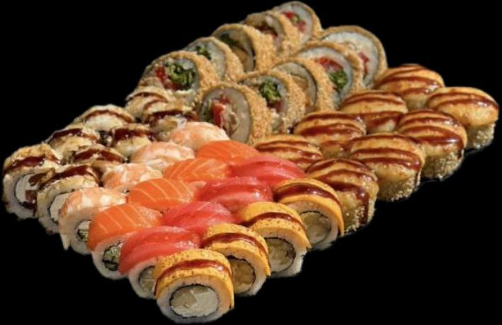 Суші-бар з частинкою італійської кухні. Найсмачніші класичні та авторські роли. Ароматна піца з безліччю сирів та начинок. На додаток до всього фрі меню та напої.